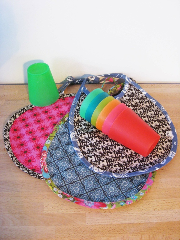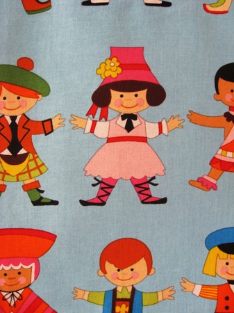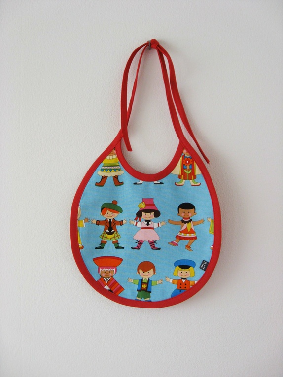 Smart smekke med fin fasong. Smekken er sydd i bomull med fargerike barn fra hele verden på turkis bunn med rød kant. På baksiden er det lagt et oransje, vannavstøtende materiale.