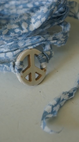 Peace tegn av sten som måler 2,5cm i diameter. Med revet Liberty stoff som ligger dobbelt og måler da ca 68cm hver.