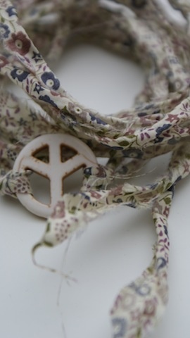 Peace tegn av sten som måler 2,5cm i diameter. Med revet Liberty stoff som ligger dobbelt og måler da ca 68cm hver.
