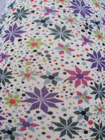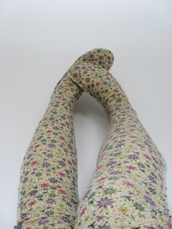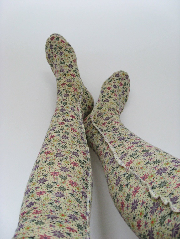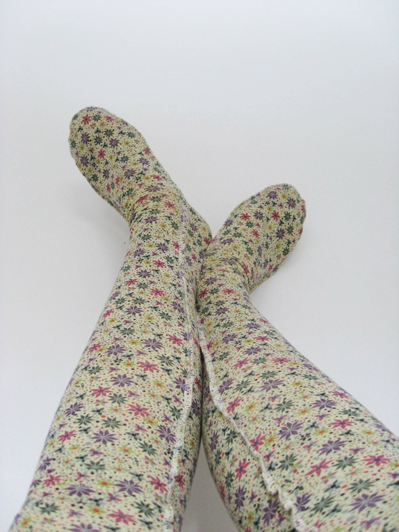 Lange, deilige knestrømper som rekker godt over knærne. De er sydd i en lys gul bomullsjersey med et virrvarr av prikker og stjerneblomster i rosa, lilla og grønnfarger. Knestrømpene er fasongsydd med en dekorativ overlocksøm på utsiden og i avslutningskanten oppe. De finnes i 2 størrelser: 36-38 og 39-41.