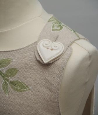 I selene er det store, hvite, hjerteformete knapper. Knappene er håndlaget i Nepal, fremstilt for hånd eller med enkle verktøy. Bedriften som lager knappene har en sosial profil, slik at vi vet at arbeiderne blir godt ivaretatt.