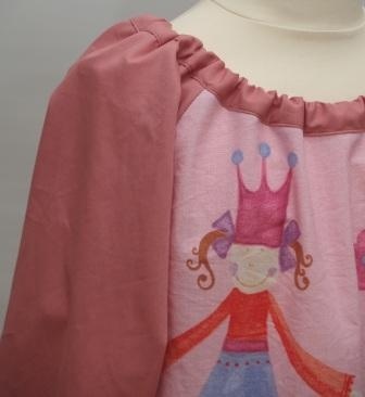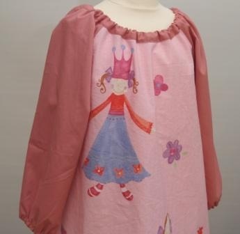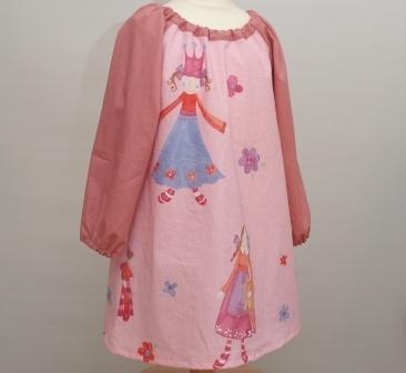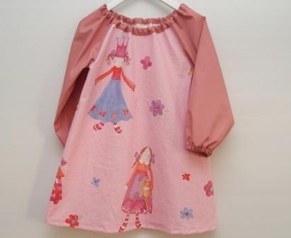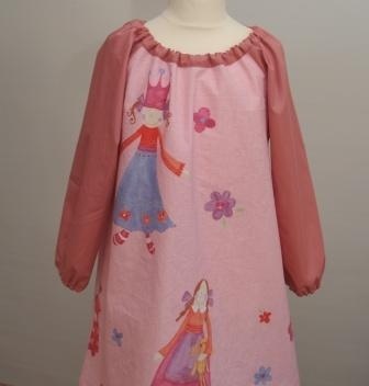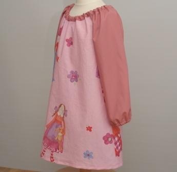 Rynkekjole med lange armer, sydd av to bomullsgardiner. Kjolens for- og bakstykke er lys rosa, med barnlige prinsessefigurer og blomster. Armene og halskanten er ensfarget gammelrosa i tynt, lett stoff.
