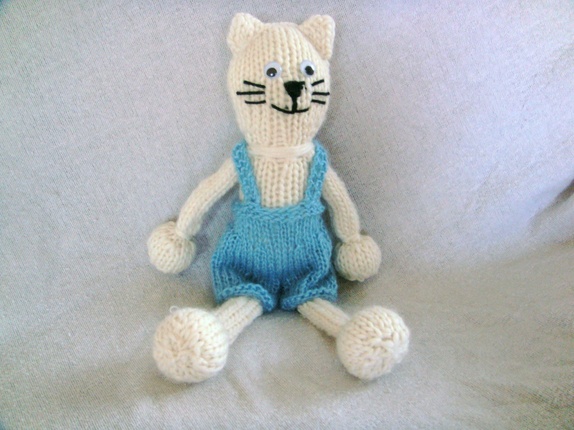 Kosedyr Katten er strikket i 50% ull og 50% akryl. Han er 33 cm lang . Har dingleben og armer ( bare hender, føtter og kroppen er fylt med vatt) De bevegelige øynene er sydd fast.