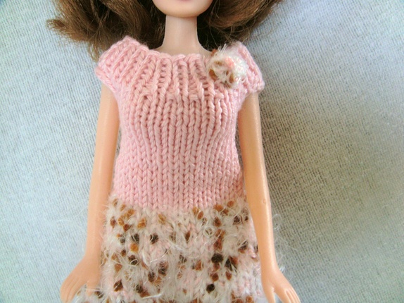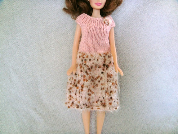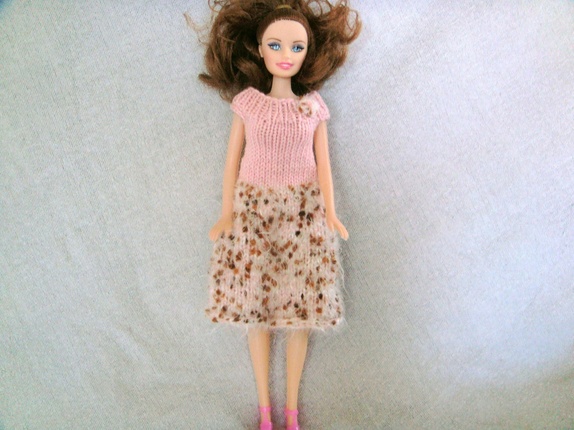Dukkekjolen til barbie er håndstrikket Gjestal bomull sport og ice.Fargen er lys rosa ,hvit og brun.Barbiekjolen er pyntet med en liten rosett av ice garnet.
