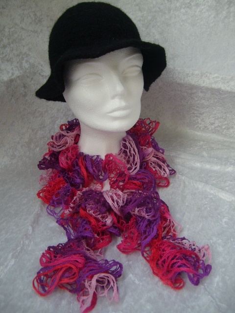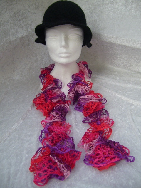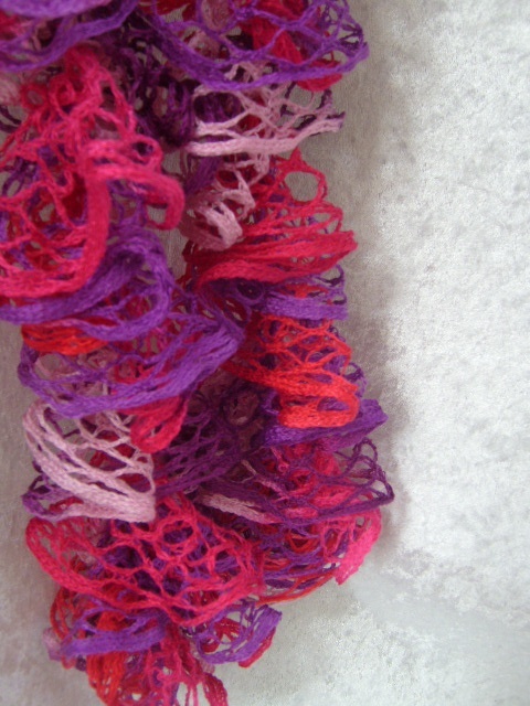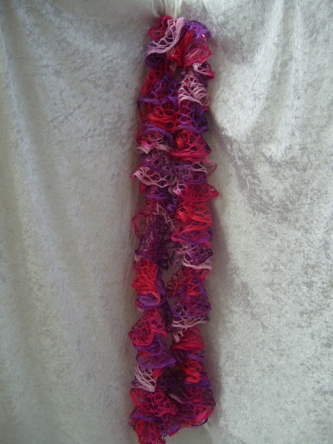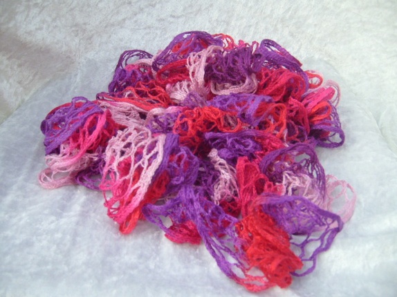 Et mykt og behagelig sjerf - boa i nydelige rosanyanser og lilla som er heklet med et stilig netting/rute-garn.