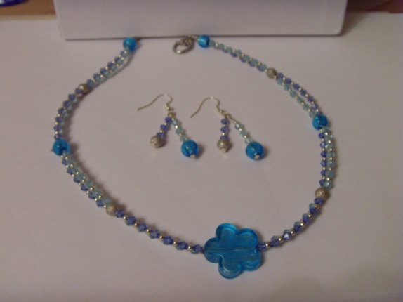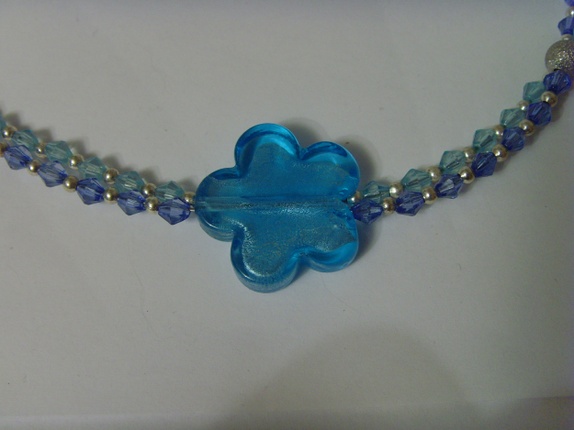 Kjedet består av bikone perler i akryl og nikkelfrie metallperler. Med jevne mellomrom er det glassperler med sølvfolie. Fokusperlen er en ca 2 cm glass-blomst med sølvfolie. Smykket er ca 43 cm langt.