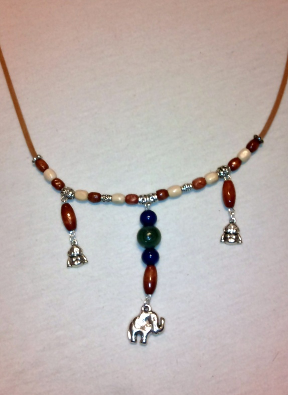 Skinnkjede i ca. 110 cm (kan justeres). Har brukt hvite/lyse og brune treperler + mellomled. 2 sølvfargede buddhafigurer, en elefant, 2 blå treperler og en grønn plastperle (motiv: mediterende buddha på den ene siden og kinesisk skrift på den andre siden).