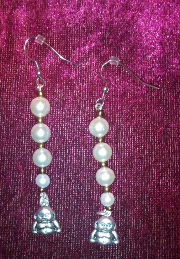 Forsølvede øredobber, med hvite voksperler, mellomledd og sølvfargede buddhafigurer.