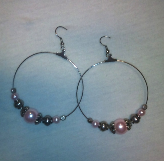 Forsølvede øreringer. Med pudderrosa voksperler, metallperler og sølvfargede mellomledd.