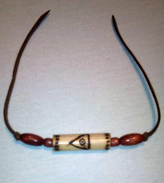 Armbånd i skinn. Jeg har brukt treperler og i midten har jeg brukt svipenn for å svi inn det altseende øyet.
