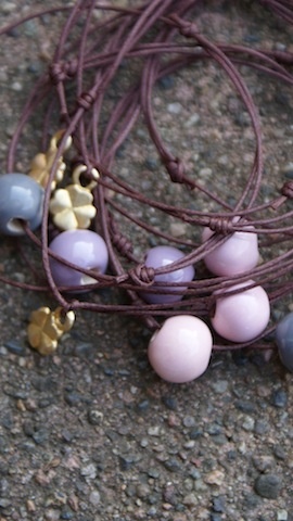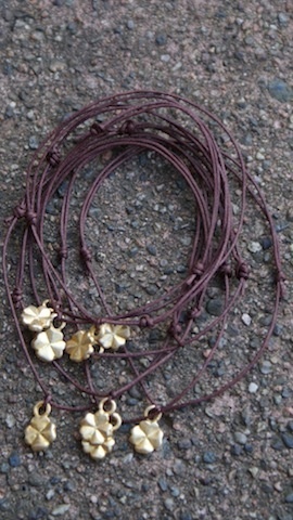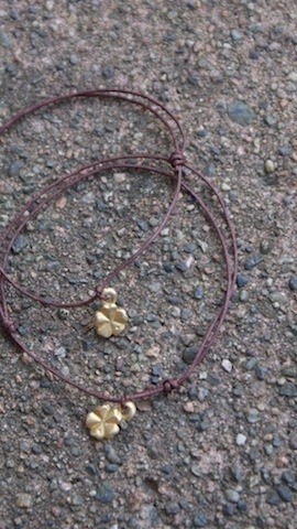 En vakker sjokoladebrun farget tynn bomullstråd voksbelagt, med et lite gullfarget charms. En firkløver som er lik på begge sider.