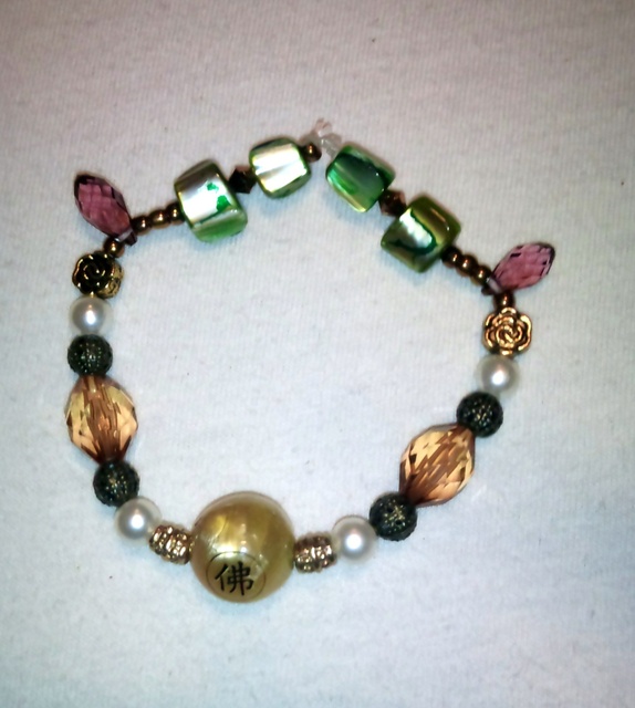 Strikkarmbånd. Med glassperler, hvite voksperler,2 gullfargede roser, krystallperler, ulike mellomledd og i midten en gulaktig plastperle med mediterende buddha og kinesiske tegn.