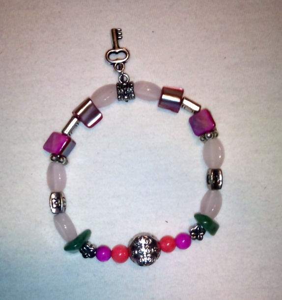 Søtt, friskt og fargerikt strikkarmbånd. Med ulike glassperler, blekrosa plastperler, ulike sølvfargede mellomledd, grønn polert kvarts og nøkkelcharm.