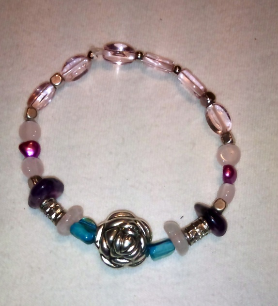 Nydelig strikkarmbånd med lilla polert kvarts, blekrosa polert kvarts, glassperler, fuksia voksperler, rosa plastperler (blekrosa + nesten gjennomsiktige), sølvfarget rose + ulike mellomledd.