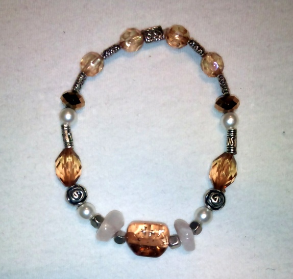Fint strikkarmbånd med krystallperler, blekrosa polert kvarts, sølvfargede roser, hvite voksperler og ulike mellomledd.