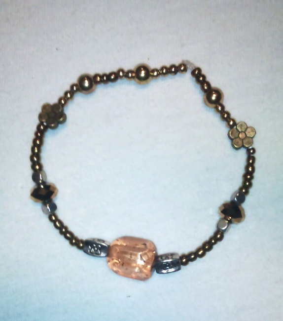 Strikkarmbånd med varme farger, framhever din indre glød:) Med krystallperler, gullfargede perler, ulike mellomledd.