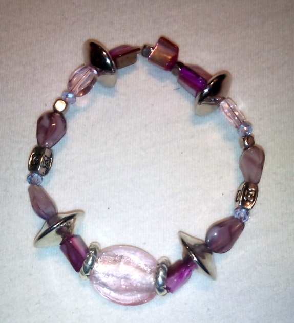Litt futuristisk strikkarmbånd. Med rosa glasstein, glassperler, små krystallperler, og ulike mellomledd.