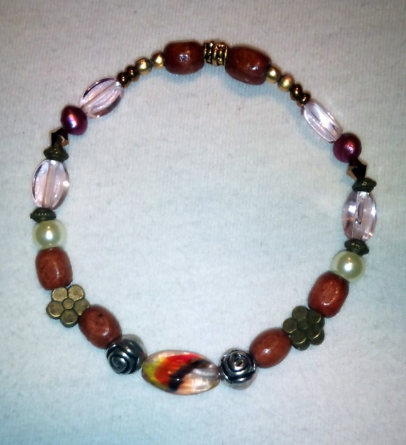 Sjarmerende strikkarmbånd. Med treperler, plastperler, sjampanjehvite voksperler, sølvfargede roser, ulike blomsterledd, i midten en flerfarget glassperle.