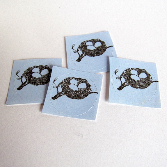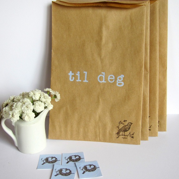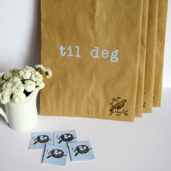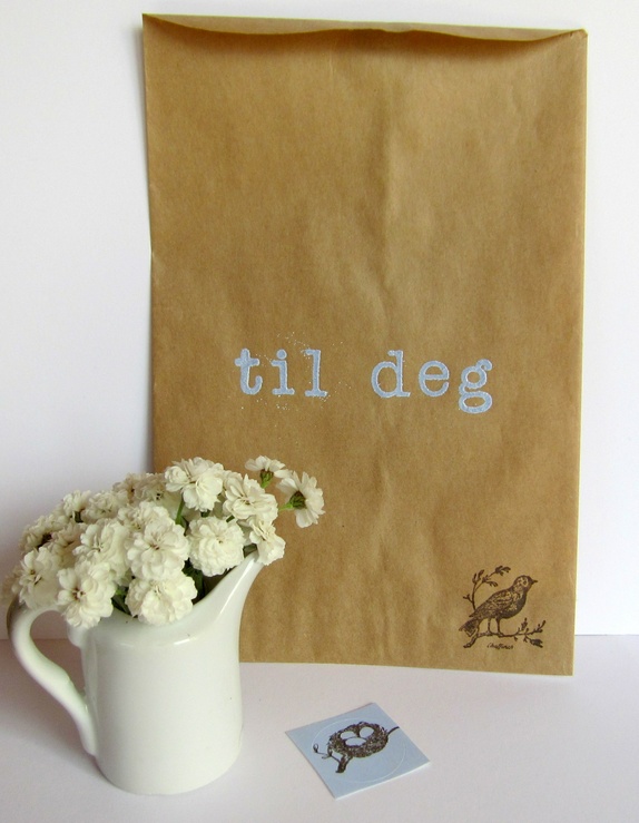 Posene er håndstemplet med en yndig fugl i mørk brunt og teksten "til deg" i lys blå embossing. Små, runde klistremerker i lys blått med påstemplet rede brukes til å lukke klaffen.