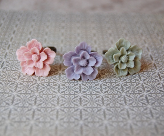 3 stk kirsebærblomst regulerbare ringer.Ringene er fra ca 1.6 cm i antikkgullfarget messing.Lusiteblomstene måler ca 2 cm