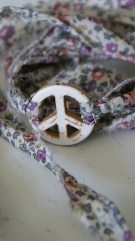 Peace tegn av sten som måler 2,5cm i diameter. Med revet Liberty stoff som ligger dobbelt og måler da ca 68cm hver.