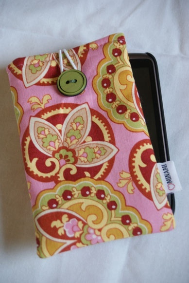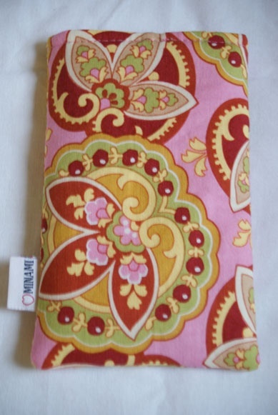 Bunnfargen til etuiet er rosa med mønster i grønt,burgunder,gult, beige og hvit.