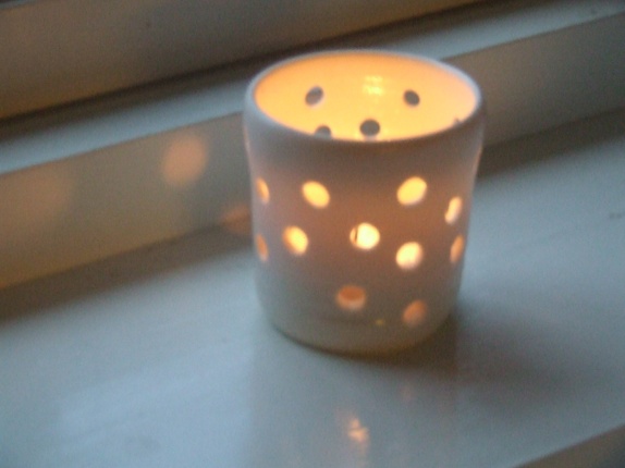 Liten t-lys lykt dreid i porselensleire. Har gjennomgått en råbrann, deretter glasert og brent en gang til på 1260 gr. Mål d: 6,5 h: 6,5