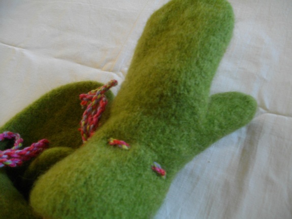 Tette og gode strikkede votter som er tovet. Vaskes som ullprodukter. Farge: grønn