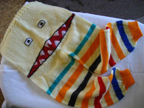 Str 2-3 år. Morsom bukse med stort monsterfjes på baken. Friske farger. Vrangbord ved anklene og i midjen, pluss strikk i midjen. Strikket i babyull, så den er tynn, men varm. Vaskes som ull uten skyllemiddel.