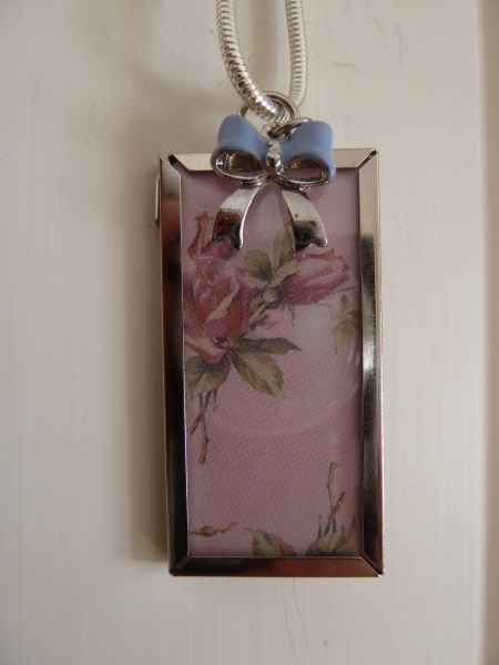 Rammen måler 2,7 x 5 cm.Du kan bruke smykket slik det er , eller sette inn ditt eget motiv,foto e.l.Rammen kan brukes på begge sider
