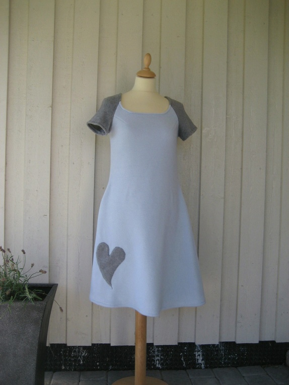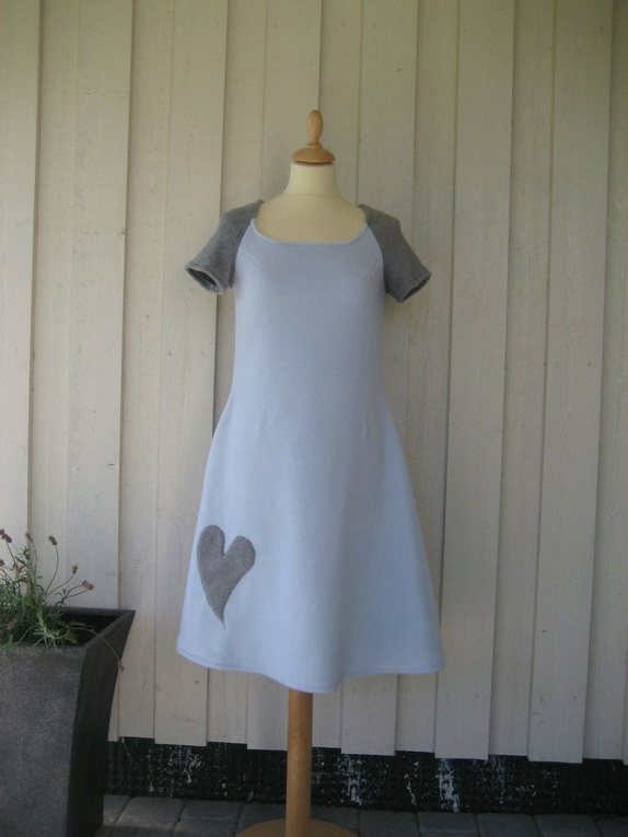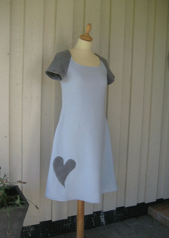 Nydelig lun kjole sydd i isblå og grå polarfleece, med korte ermer siden vi går mot vår og sommer. Kjolen er pyntet med en applikasjon av et hjerte