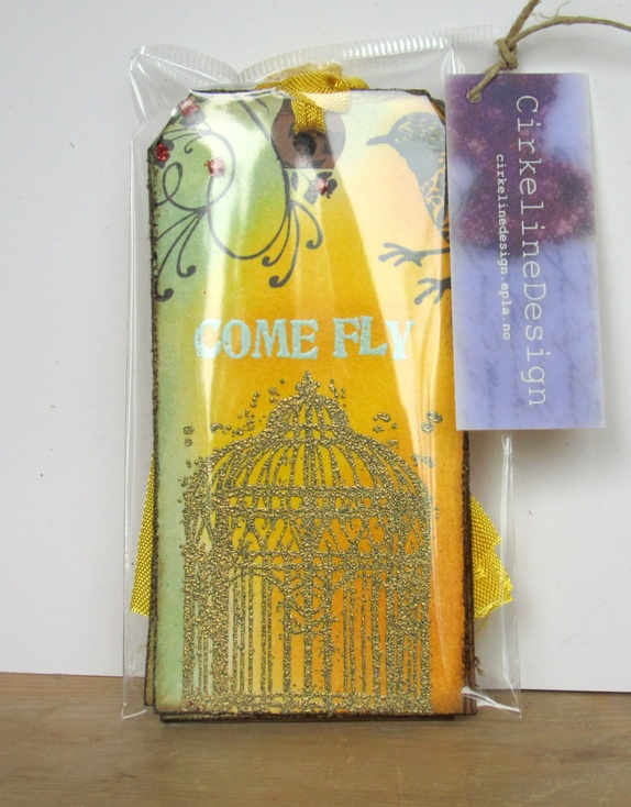 Lappene er håndfarget med gult, oransje og lys turkis, og motivene er håndstemplet. Fugleburet er embosset med gullfarge, og "Come Fly" er embosset i lys turkis. På grenen er det små "bær" av rødt glassglitter. På baksiden er det stemplet "Til" og "Fra", og det er plass til en personlig hilsen. Oransje sløyfebånd hører med.