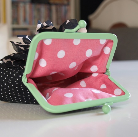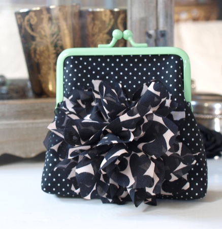 Portemone sydd i sort m/hvite prikker stoff,blomst sydd på.Foret med rosa /hvite prikker stoffvliselin mellom lagene.Veskelås av messing, måler 10,2 cm.Portemone målerpå det bredeste: 12 cmhøyde : 13 cm