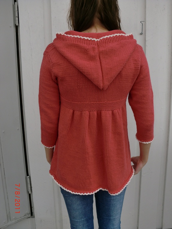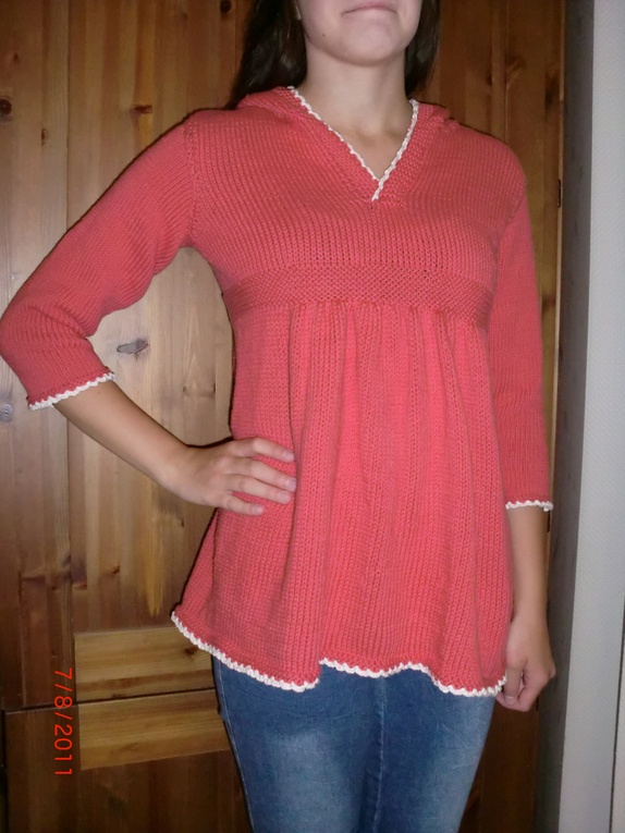 Pen hjemmestrikket genser i Drops-design med hette og korte ermer. Strikket med "Paris" str S-M