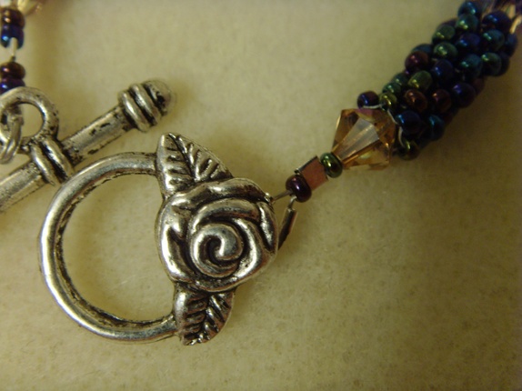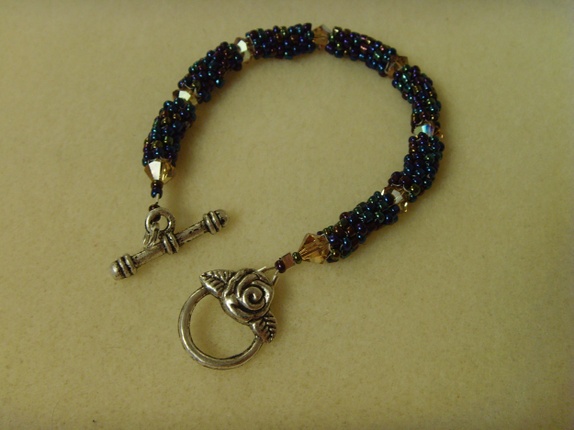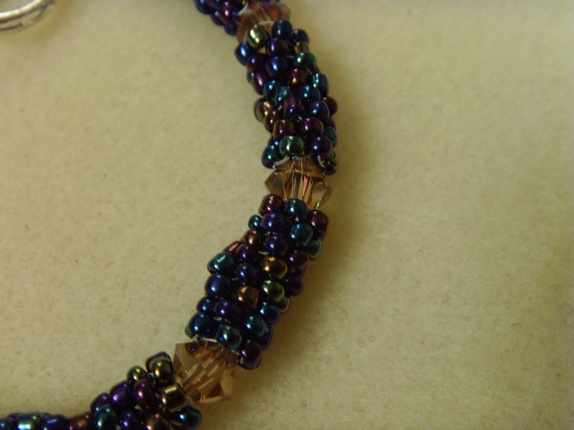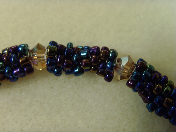Seed-beadsene er sydd sammen til tuber, og tredd på tigertail sammen med swarovski krystaller i fargen light colorado topas.