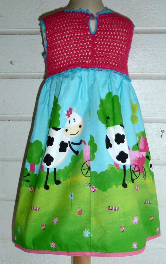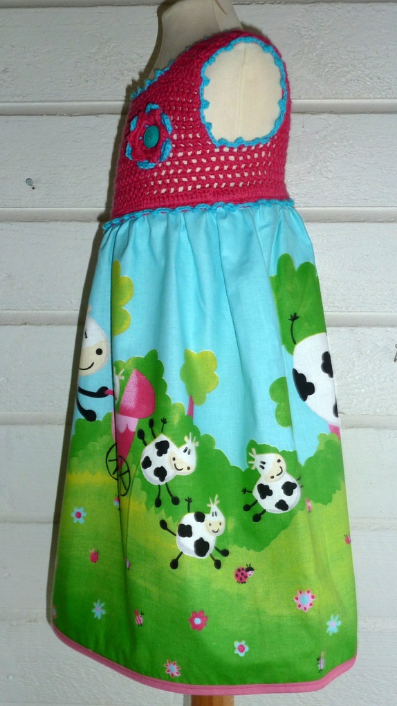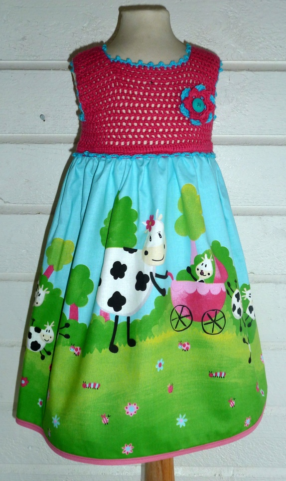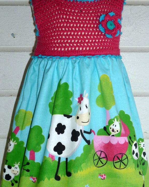 Skjørtedelen er i bomullsstoff med kumotiv.