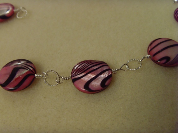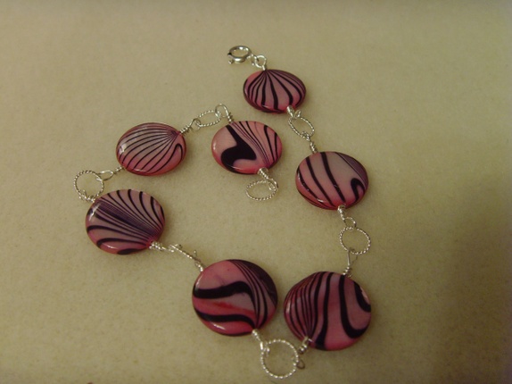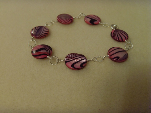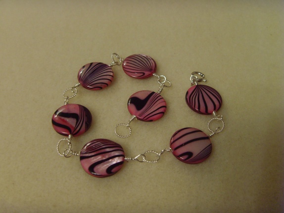 Armbåndet består av runde, flate skjellperler med svarte striper. Stripene ligger litt forskjellig på hver perle, noe som gir liv til armbåndet. Perlene har en nydelig lys rosa nyanse.