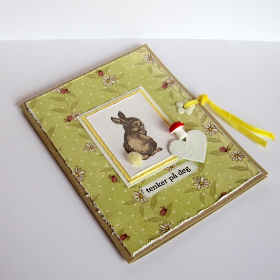 Det er pyntet med søtt designpapir i grønt, et håndstemplet motiv av en søt kanin med pompong-hale, et hvitmalt hjerte og en liten fluesopp. I kortets åpning er det hull med maljer og et gult fløyelsbånd. "Tenker på deg" er håndstemplet i sjokoladebrunt på hvit maling. Baksiden av kortet har mitt stempel.