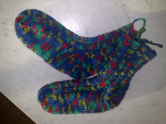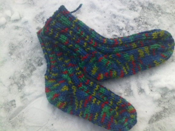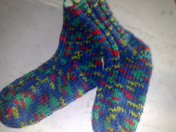 Deilige ullsokker til barn strikket i flerfarget raggegarn. De er strikket med ribbestrikk opp på risten slik at de sitter godt på foten.Vaskes på 40 grader.