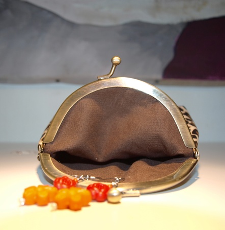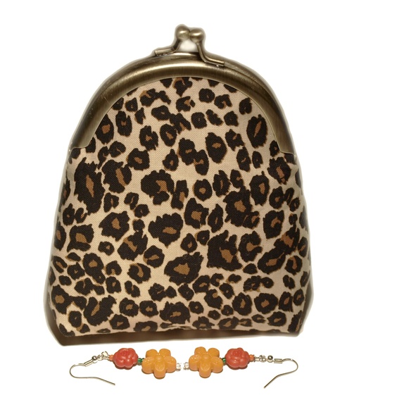 Portemone sydd i leopardprint stoffForet med brunt stoff.Veskelås av messing, måler 10 cm.Vliselin mellom lagene.Portemone målerpå det bredeste: 12 cmhøyde : 14 cmørepynt måler ca 4 cmnikkelfri ørekrok