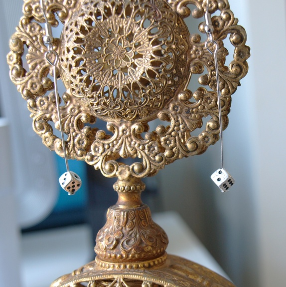 små søte miniatyr terninger i metall.Selve terningene måler 0,5 x 0,5 cm.Ørepynt måler ca 6 cm inkl. kroker.Nikkelfri ørekrok