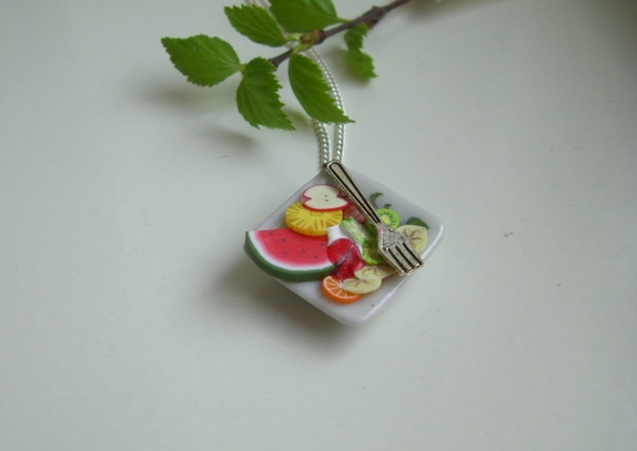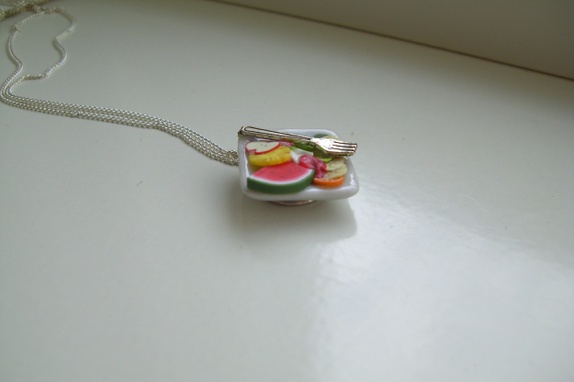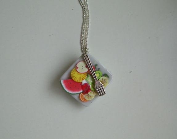 Bon Apetite ! En herlig frukttallerken med oppskåret frukt. Tilberedt på gammeldags firkantet porselenstallerken fra Le Petit Cafè. Henger på sølvfarget lenke ca. 47 cm lang.