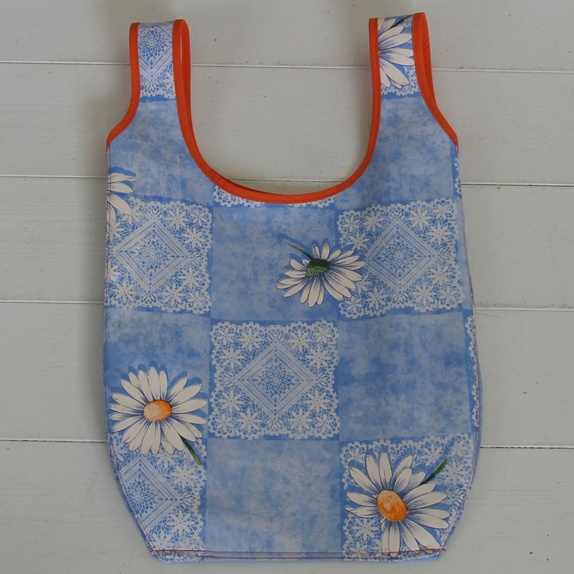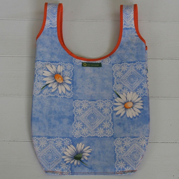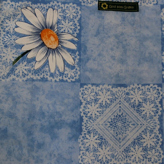 Sydd av en lyseblå voksduk med mønster av blonder og prestekrager. Voksduken er fra loppemarked. Oransje skråbånd langs hankene og God som Grønn-merkelapp på den ene siden.