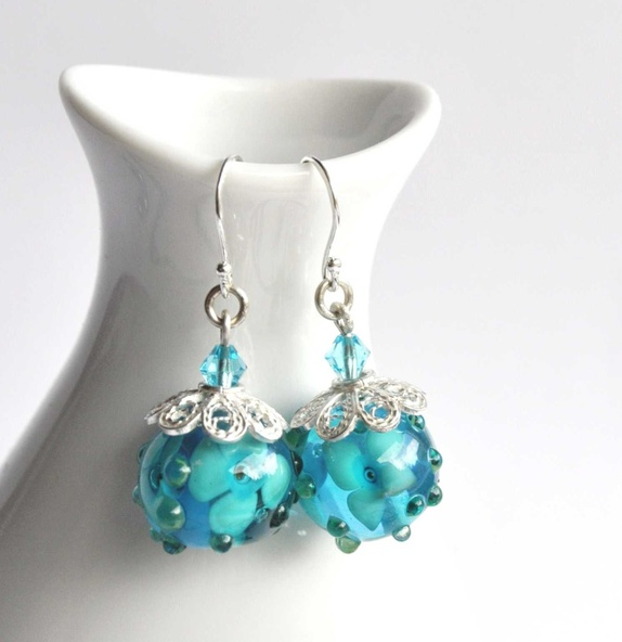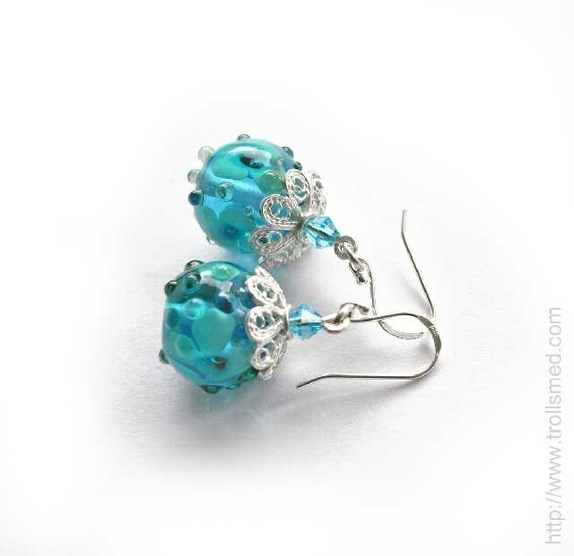 Håndlagde unike øredobber, med håndlaget sølv 8bladsroser, og håndlaget perler i vakker turkis.