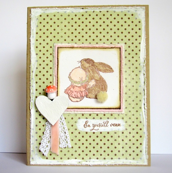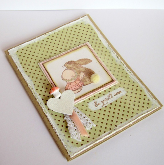 Det er dekorert med grønt, prikkete designpapir og et håndstemplet og fargelagt motiv av et lite barn med armen rundt en kanin, som har en pompong på halen. Et hvitmalt hjerte med en liten fluesopp og blonder og fløyelsbånd pynter opp. "En spesiell venn" er håndstemplet mørk brunt.