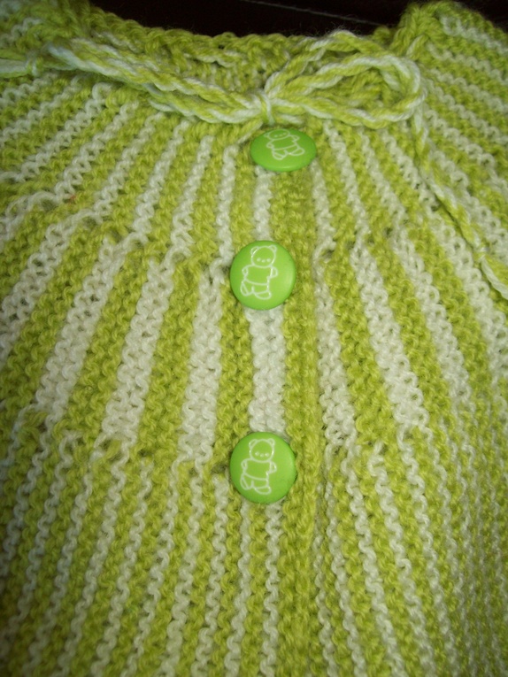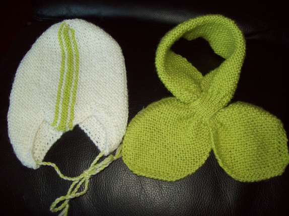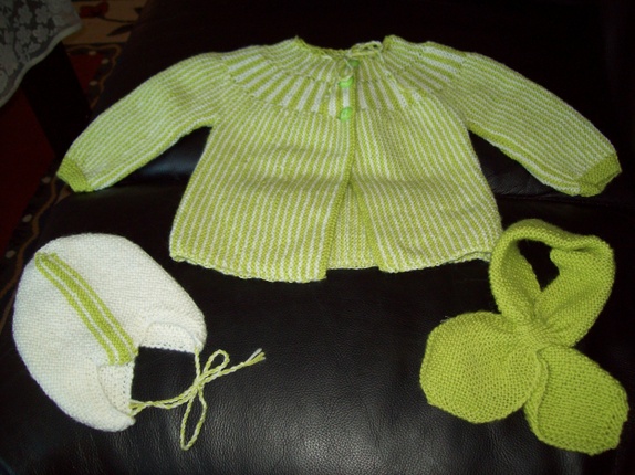 Settet består av jakke, lue og smetteskjerf strikket i myk og kløfri Merinoull. Størrelse 6 måneder.