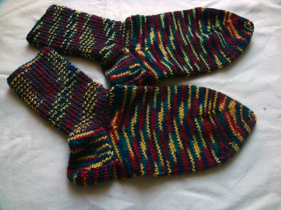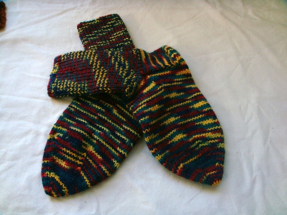 Gode varme ullsokkene strikket i raggegarn.Fargene på sokkene er gul,vinrød,grønn og blå.Sokkenes fotblad er 26 cm Maskinvask 40 grader uten skyllemiddel