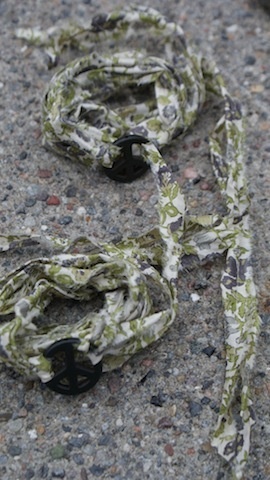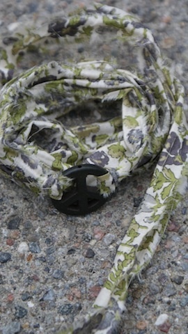 Peace tegn av sten som måler 2,5cm i diameter. Med revet Liberty stoff som ligger dobbelt og måler da ca 68cm hver.