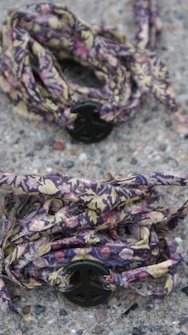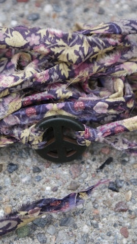 Peace tegn av sten som måler 2,5cm i diameter. Med revet Liberty stoff som ligger dobbelt og måler da ca 68cm hver.