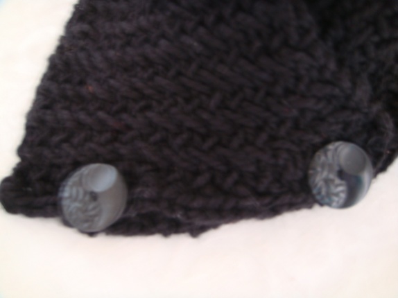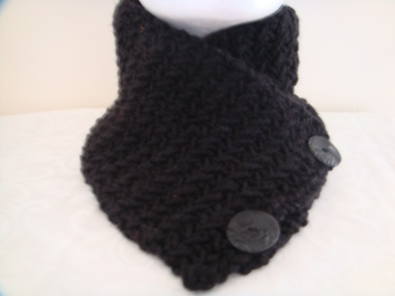 Halsen er strikket i Idena Twist (100% akryl)Og pyntet med to knapper,som også fungerer som åpning og lukking av halsen.passer til dame.Håndvask. Før pris :150,-
